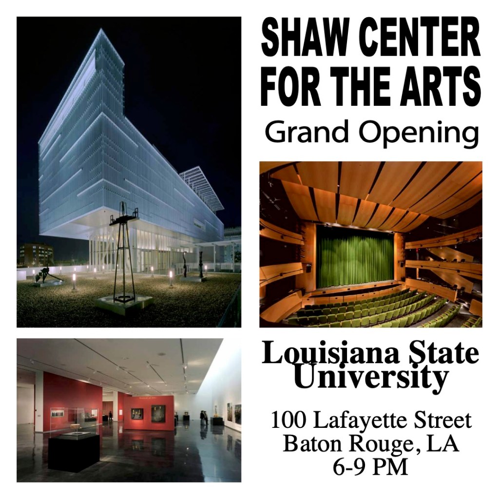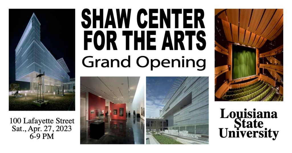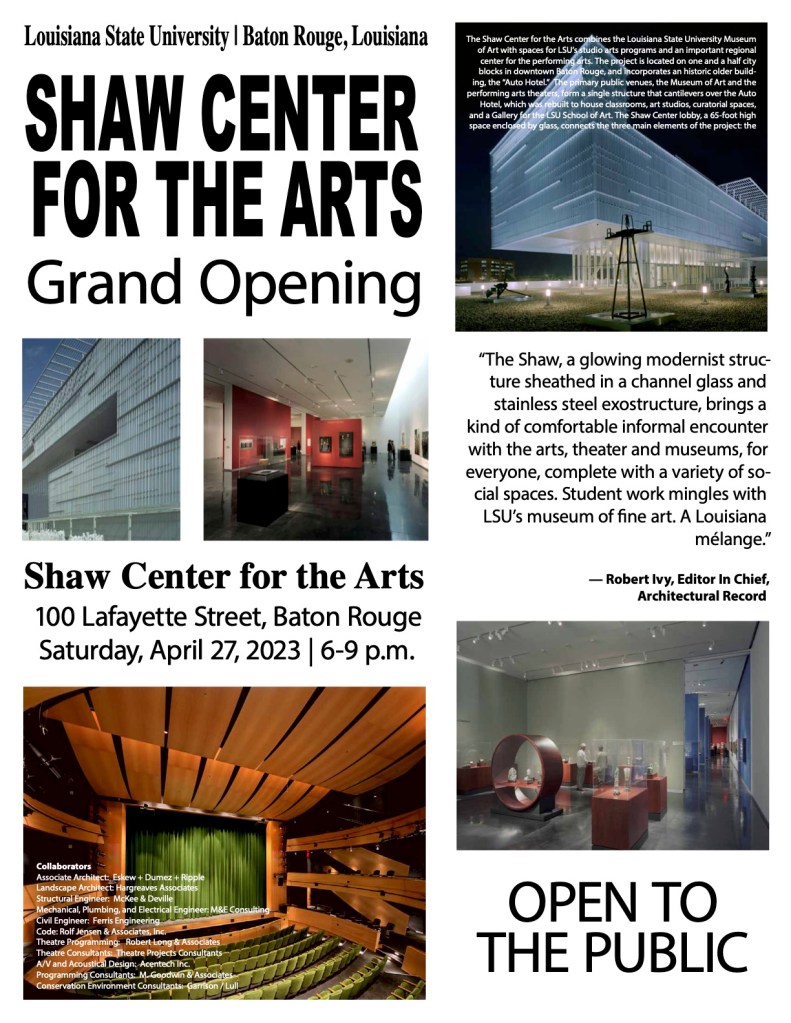 The Shaw Center for the Arts officially opens its doors! Experience world-class art, performance, and design at LSU’s newest cultural landmark. Join us Sat., Apr. 27, 2023 | 100 Lafayette Street | 6–9 PM